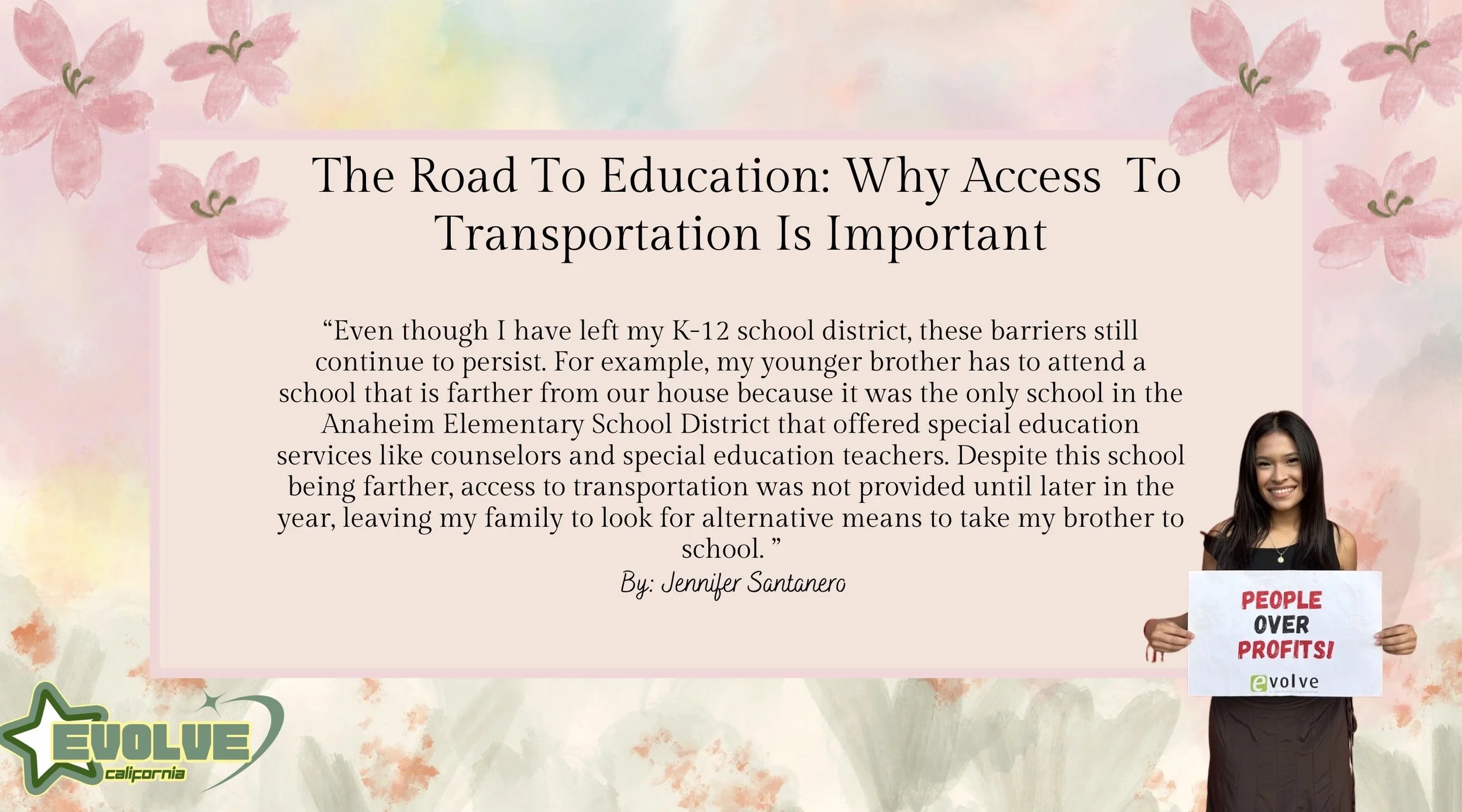 Even though I have left my K-12 school district, these barriers still continue to persist. For example, my younger brother has to attend a school that is farther from our house because it was the only school in the Anaheim Elementary School District that offered special education services like counselors and special education teachers. Despite this school being farther, access to transportation was not provided until later in the year, leaving my family to look for alternative means to take my brother to school. While attending community college, I was responsible for taking my brother to school and back, forcing me to adjust my college class schedule and work schedule to his schedule. If access to a reliable transportation service were available, it would have allowed me to focus on my studies and take the time to catch up on homework or enroll in classes I never had the opportunity to take.
